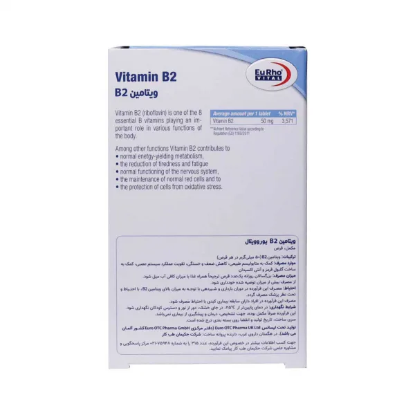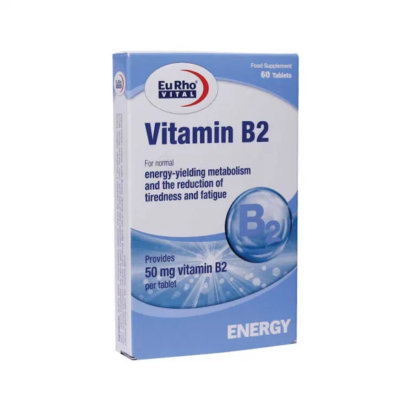 قرص ویتامین B۲ یوروویتال ۵۰ میلی گرم یک مکمل غذایی است که جهت افزایش انرژی و کاهش ضعف و خستگی مورد استفاده قرار میگیرد. همانطور که میدانید ویتامین B۲ یک ویتامین محلول در آب است که از طریق جریان خون منتقل میشود. به همین سبب بدن قابلیت ذخیره سازی آن را نداشته و برای تامین نیاز به استفاده از مکملهای غذایی همچون قرص ویتامین B۲ یورویتال داریم. این محصول ضمن تامین ویتامین ب ۲ مورد نیاز بدن، به متابولیسم طبیعی بدن کمک کرده و عملکرد سیستم عصبی را بهبود میبخشد. تامین انرژی مورد نیاز بدن، ساخت گلبول قرمز، حفاظت از سلولها در برابر استرس اکسیداتیو و کاهش خستگی مزمن از جمله فواید خرید قرص ویتامین و استفاده از آن است.